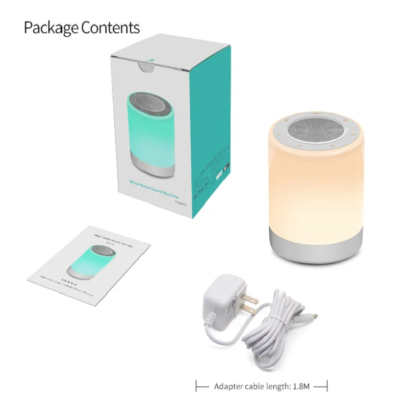 Лампата за сън има бял шум, розов шум, кафяв шум, шум от вентилатор, гръмотевици, речен дъжд, морски вълни, пламък, щурци, жаба, глас на влака, сърцебиене, приспивни песни и др. Прилична звукова машина за сън с функция за изключване за помощ при заспиване на бебета, деца и възрастни. И се използва за среднощно кърмене и смяна на пелени, успокояващи деца. Има 7 цвята LED, слабо бяло, ярко бяло, червено, синьо, зелено, лилаво, оранжево.